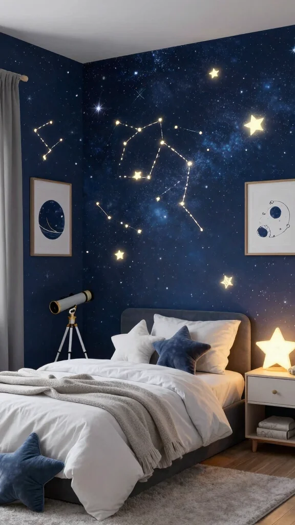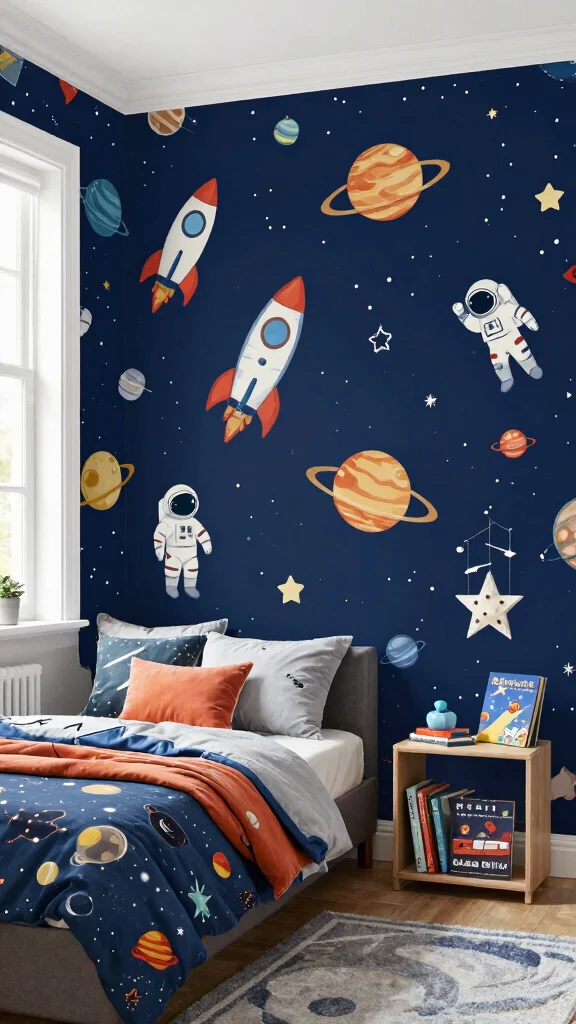 Ensure the wallpaper uses non-toxic inks for a safe sleeping environment. Creating a cozy reading corner with space-themed books adds to the enchanting atmosphere.