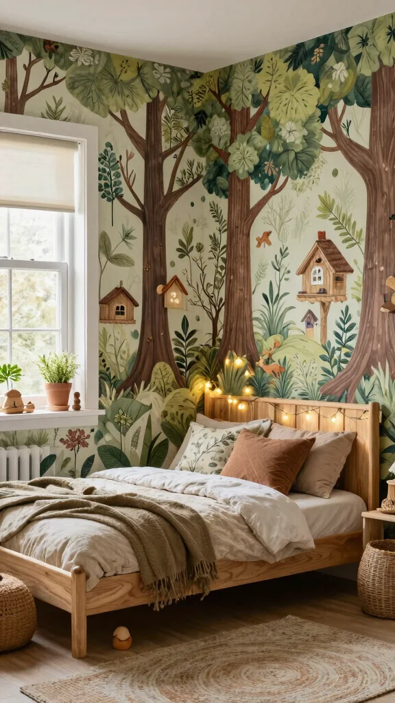 Choosing removable wallpaper allows for easy updates as your child’s interests change. A wall mural can deepen the forest theme and create a stunning focal point.
