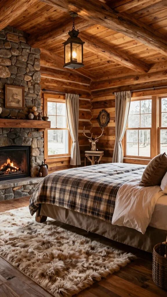 If cozy cabin aesthetics speak to you, a log cabin-inspired master bedroom could be your ideal retreat. Pairing wooden walls and ceilings with rich, plush bedding in flannel or plaid creates a warm and inviting space. A striking stone fireplace serves as a beautiful focal point, making chilly nights feel snug and romantic. This combination not only exudes rustic charm but also connects you to nature in a comforting way.