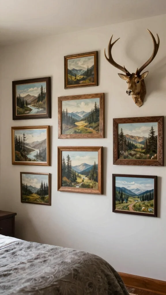Wall decor is vital for adding personality and charm to your Western master bedroom. Create a gallery wall showcasing art that reflects your love for the West, such as landscape paintings or wildlife photography. Incorporate rustic wooden frames or metal wall art to elevate the theme. Textured wall decor—like woven hangings or mounted antlers—adds dimension and interest to your space.