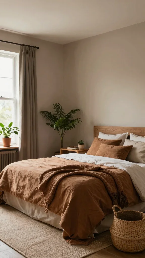 To implement this color scheme, consider experimenting with various earth tones for added depth. Opt for organic fabrics like cotton and wool for bedding, and think about adding plants for a touch of life and vibrancy in the room.