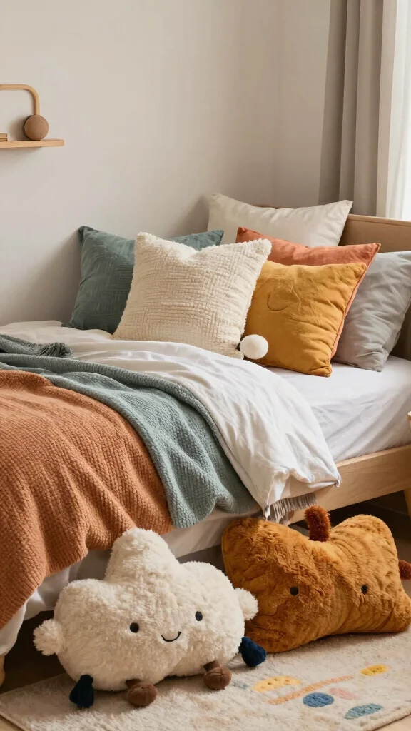 Adding textured pillows enhances both comfort and style in a whimsical bedroom.