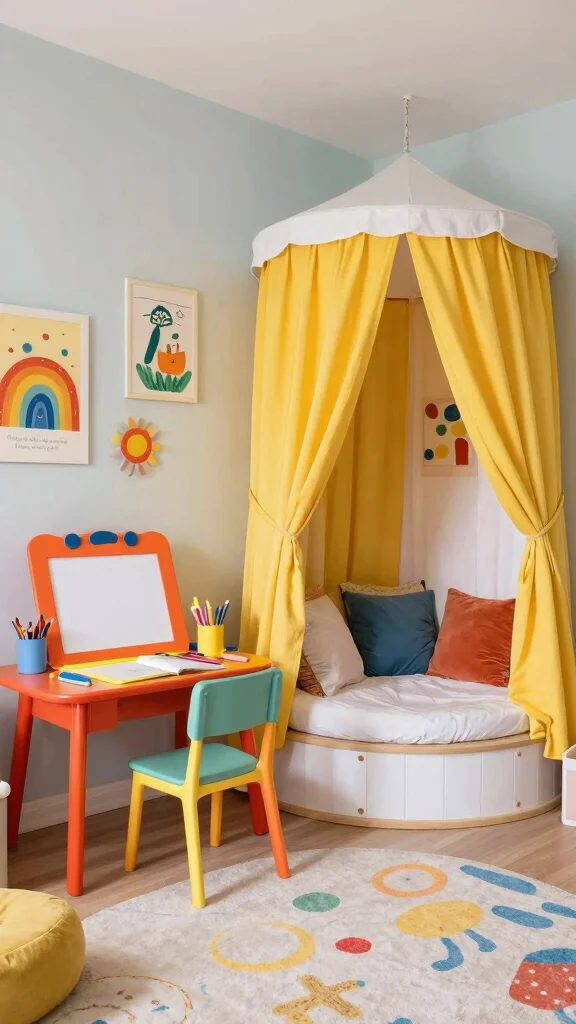 Each element, from playful decor to thoughtful organization, aims to make their room not just a place to sleep but a magical retreat that encourages imagination and playfulness.