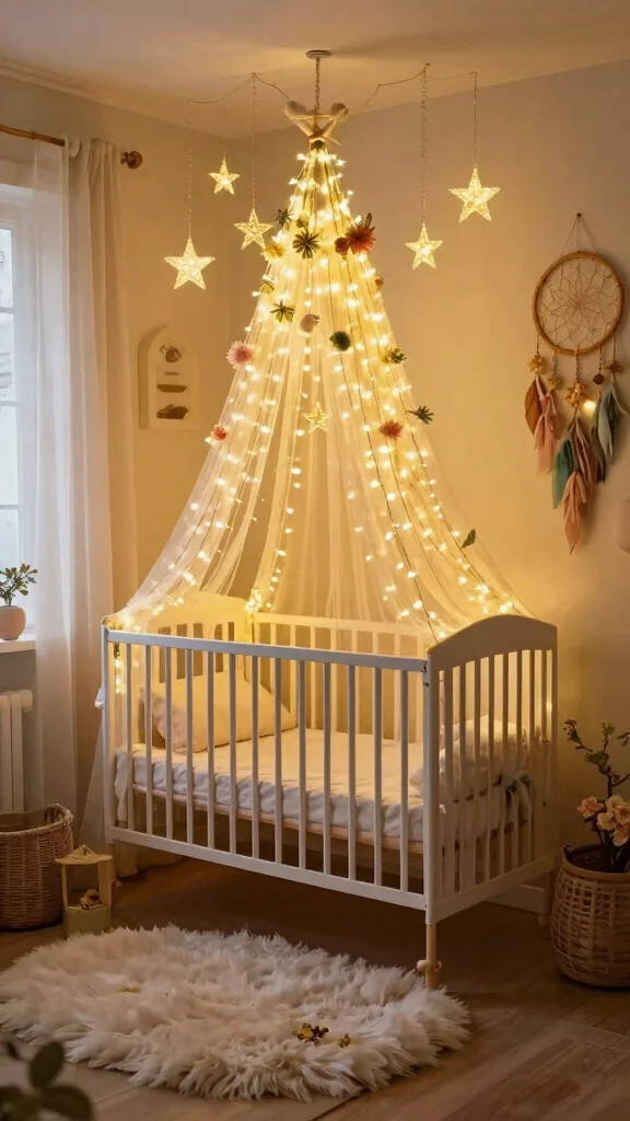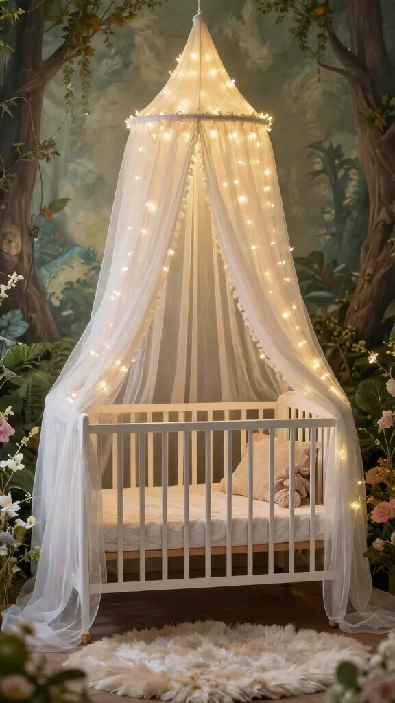 Add a dreamlike element to your nursery with a canopy over the crib. This soft draping can create a cozy, cocoon-like feel that enhances the woodland fairy theme. Opt for light, airy fabrics like tulle or muslin to maintain an open and bright atmosphere while providing a sense of security for your little one.