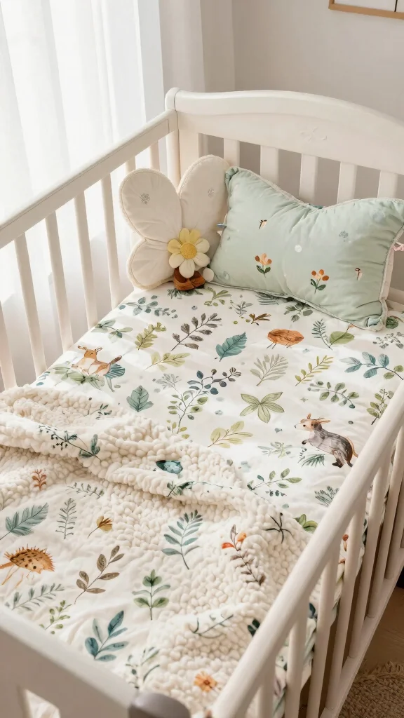 Fun fact: For a soothing woodland fairy nursery ideas vibe, use 3-5 nature-inspired elements like leaves, blossoms, and tiny woodland creatures on crib bedding. Layer breathable textures—soft sheets, a plush throw, and decorative pillows—for instant cozy magic.