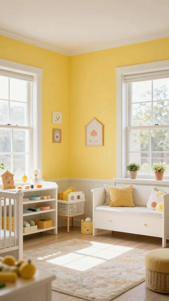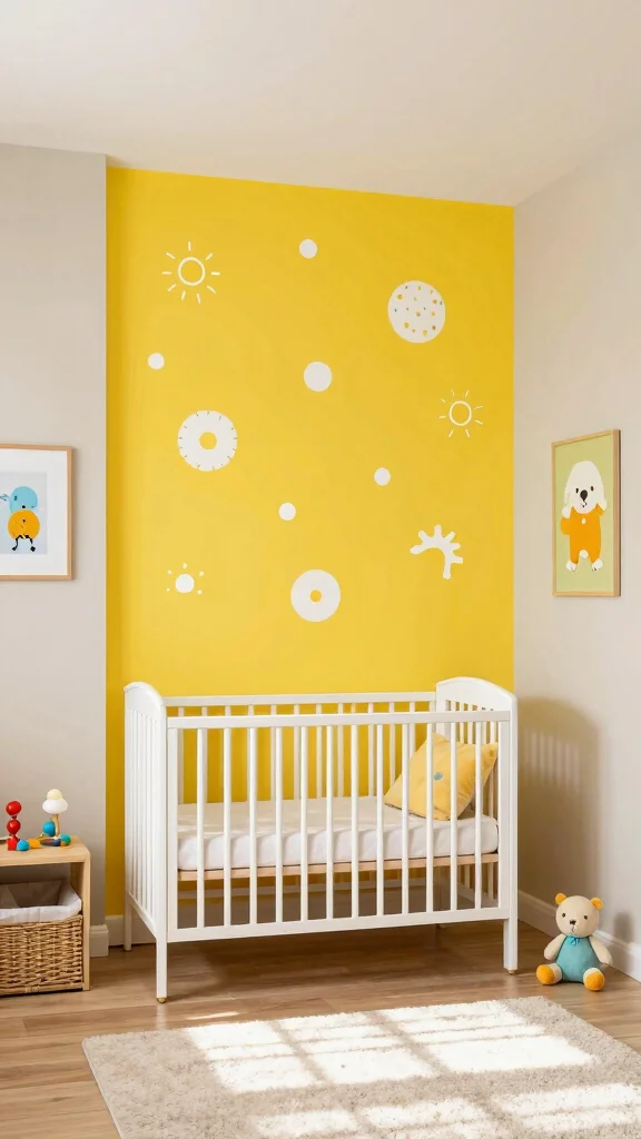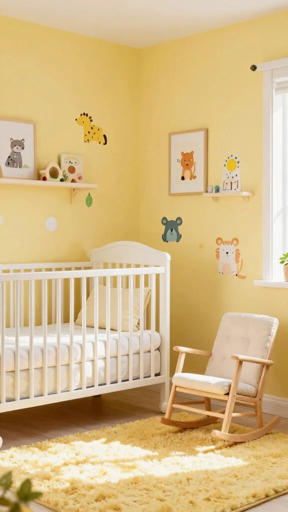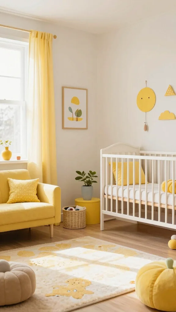 To keep yellow from taking over, build a balanced nursery color schemes around neutrals. Pair pale yellow with white, soft gray, or sage green, and use yellow as an accent rather than the main wall color. Try a palette like pale yellow walls, white trim, gray furniture, and a few mustard-yellow textiles. Introduce pattern through cushions or a rug with small yellow motifs for playfulness, not overwhelm. Choose durable, washable fabrics and natural materials for easy maintenance and baby room inspiration that feels calm and cheerful.