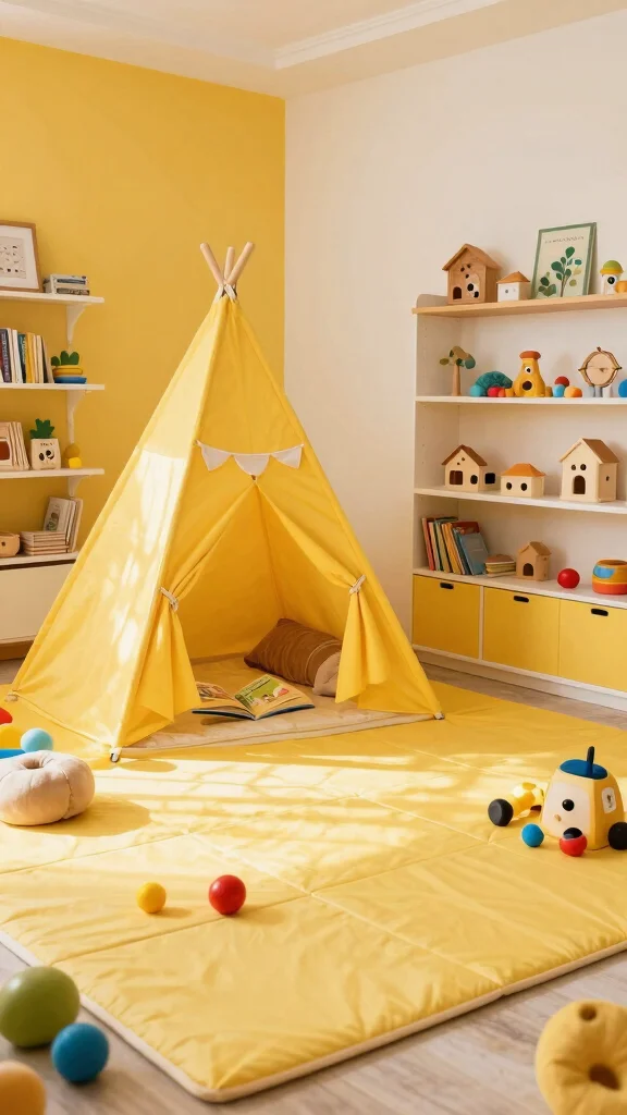 Yellow accent ideas that are safe and eco-friendly include: textiles in organic cotton or bamboo; a jute or wool rug with yellow accents; natural wood or rattan furniture; wall art printed on recycled FSC-certified paper; non-toxic yellow lighting like warm-LED lamps; and window coverings like bamboo blinds. Use non-toxic paints if painting a wall or ceiling and choose child-safe finishes. These yellow accent ideas keep the space lively yet safe and align with eco-friendly principles for a cheerful nursery decor.