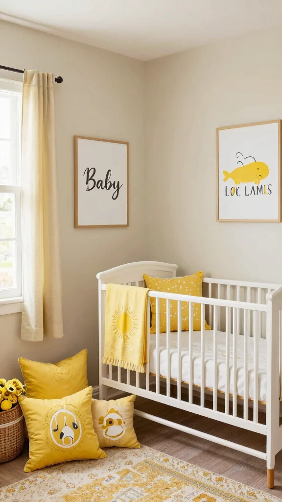 – Personal Touches: Personalize your nursery with unique yellow-themed touches, such as wall decals or a whimsical mobile, to create a one-of-a-kind atmosphere.
