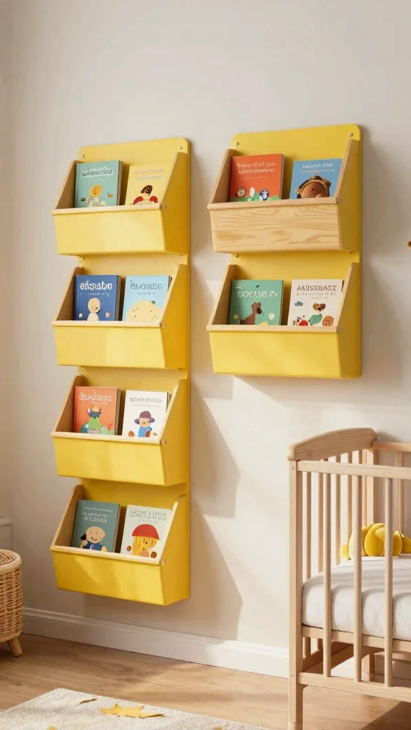 Keeping your nursery organized can be stylish with functional yellow wall organizers. These organizers are perfect for storing books, toys, or art supplies, maintaining a tidy space while adding a splash of color. Look for eco-friendly options made from sustainable materials to prioritize safety and environmental consciousness.