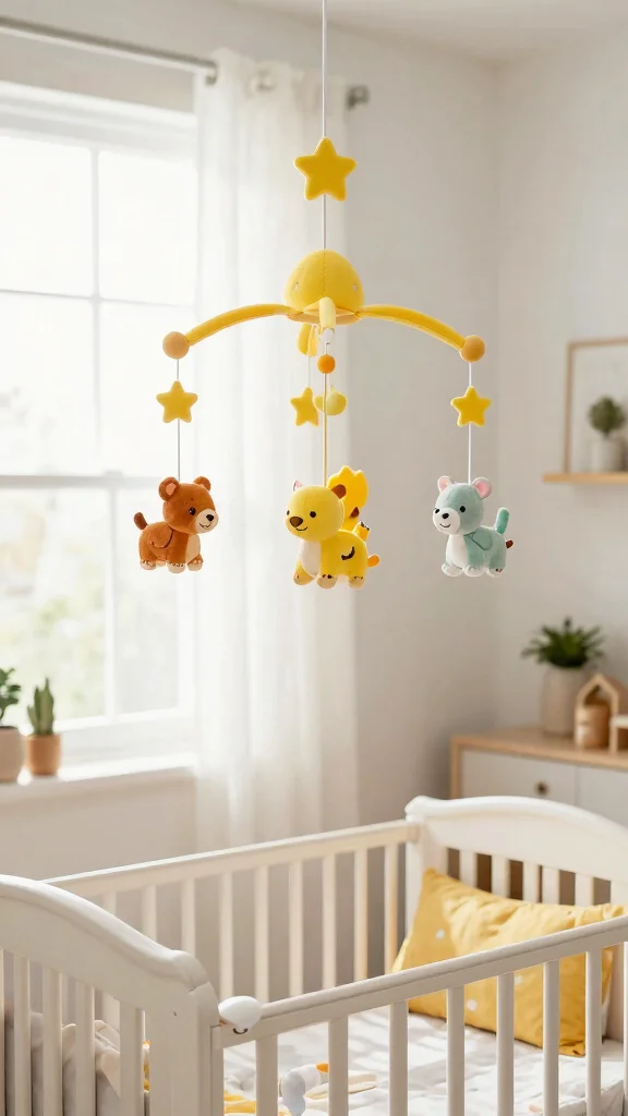 A whimsical yellow mobile adds a delightful touch to your nursery, capturing your baby’s attention and imagination. Look for eco-friendly options made from sustainable materials that twirl gracefully above the crib. Designs featuring animals, stars, or clouds in cheerful yellow create a joyful focal point in the room.