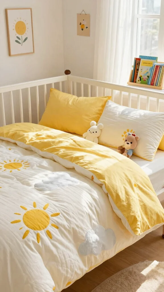 Sunshine-themed bedding instantly brightens your nursery and brings a joyful spirit to the space! Look for bedding sets adorned with sun motifs, cheerful clouds, or playful rainbows in various shades of yellow. These lively designs not only add color but also foster a playful atmosphere for your little one.