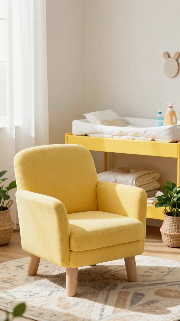 Adding yellow accent furniture brings a vibrant touch to your nursery and can instantly uplift the design. Think about including a charming yellow accent chair or ottoman, which provides both comfort and style. This splash of color acts as a focal point, beautifully balancing with neutral tones.