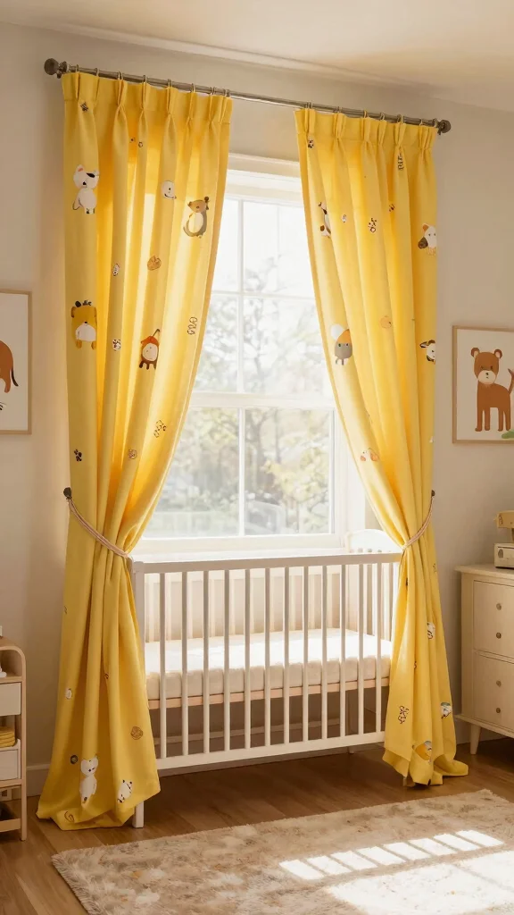 Playful yellow curtains can unify your nursery decor, providing privacy while allowing soft light to filter in. Opt for lightweight, breathable fabrics that gently diffuse sunlight, creating a cozy ambiance. Patterns such as polka dots, stripes, or whimsical illustrations add a delightful element to your decor.