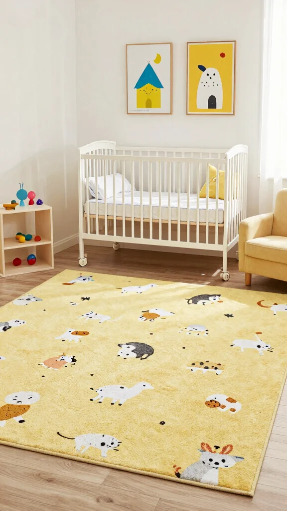 An eco-friendly yellow rug adds warmth and texture to your nursery, while being kind to the planet. Look for rugs made from natural fibers like jute, cotton, or hemp, which are durable and safe for little ones. A yellow rug can anchor the room, creating a cozy play area for your baby.